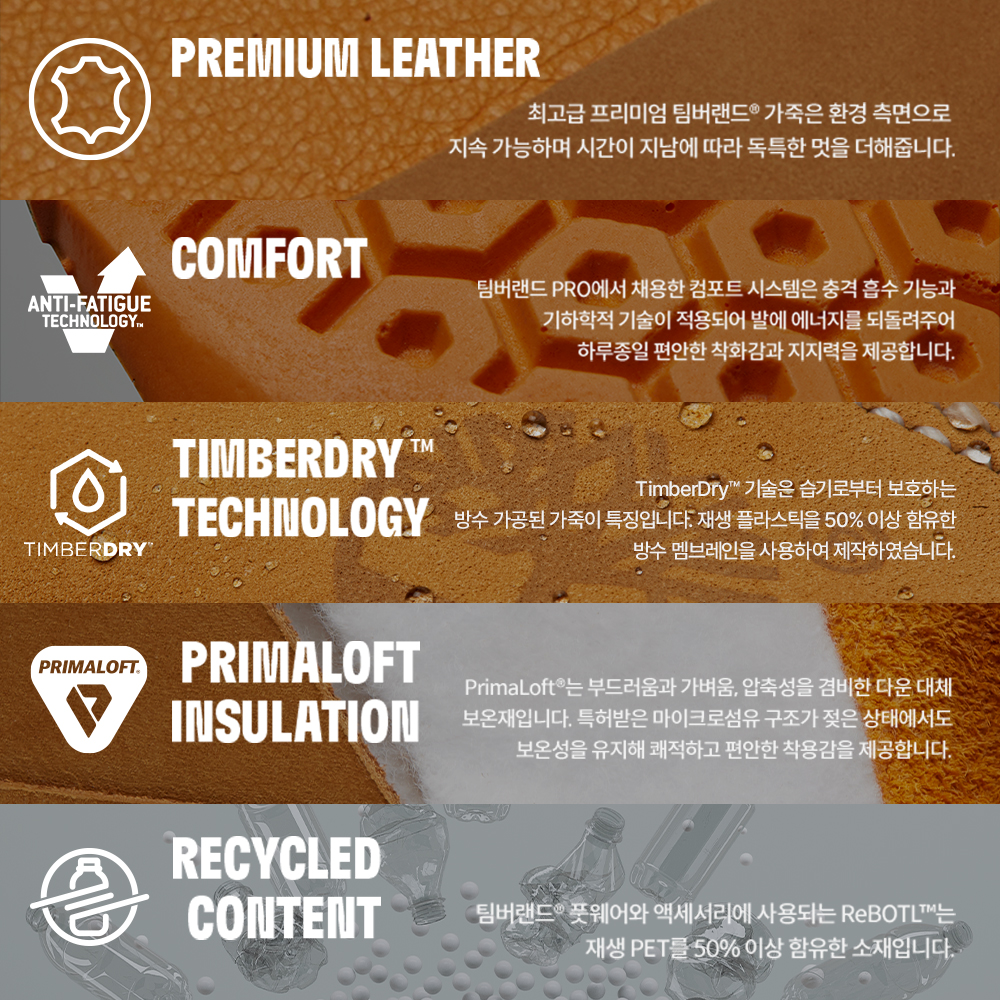 프리미엄 Timberland® 방수 가죽 소재 어퍼와 메시 원단 | LWG(Leather Working Group) 인증 가죽 | 재생 플라스틱을 50% 이상 함유한 ReBOTL™ 소재 안감 | D링 레이스 시스템 | 패딩 칼라 | PrimaLoft® 보온재 200g | 피로 방지 탈착식 풋베드 | 아치 지지용 섬유 유리 섕크 | TimberDry™ 방수 멤브레인 | 고무 러그 아웃솔